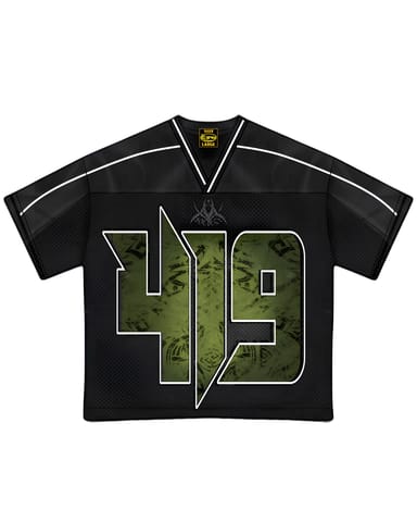 -The colorway features black, white, and green. - material = polyester, finished with a see-through mesh net, and stitched with clean white stripes across the material. -The logo is silicone. The number 419 is screen-printed in bold green, front and center.