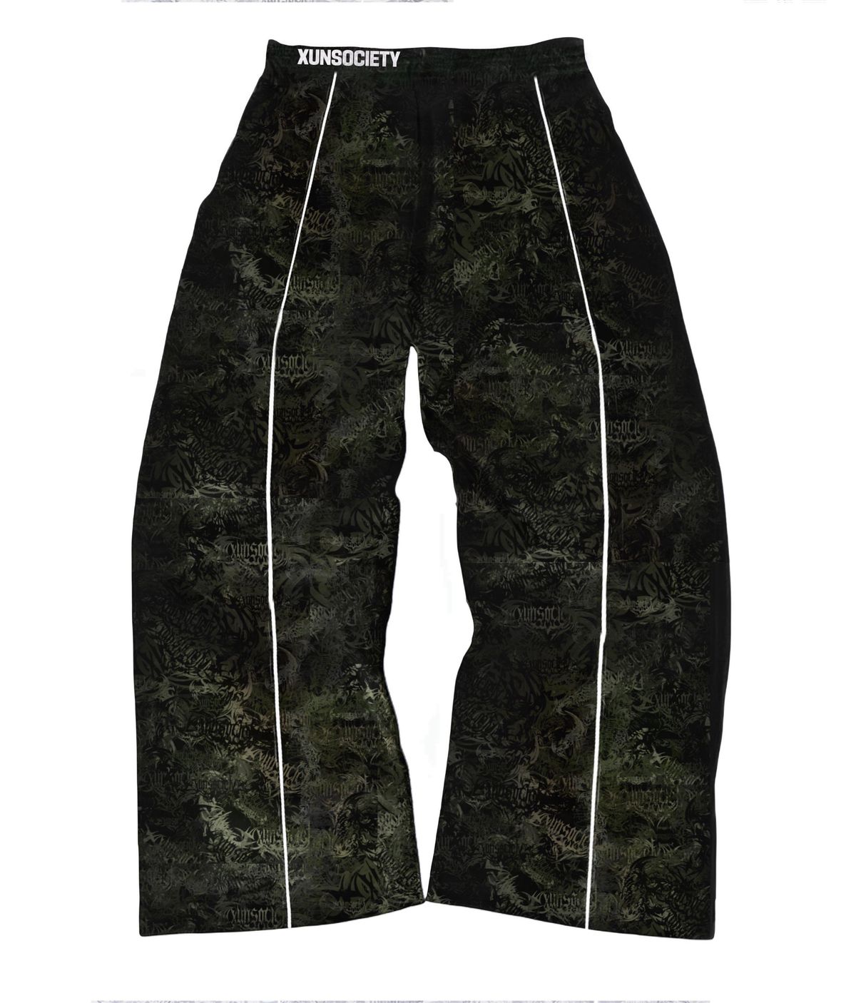 • Material: Polyester• Print: Dark, intricate sublimation print• Details: Vertical white stripes on each leg and "XUNSOCIETY" in white on the waistband .